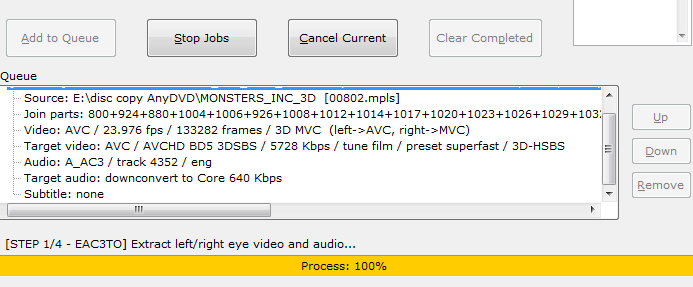 I'm trying to find a way to get SBS format for my Monsters, Inc 3D BD. I've ripped the disc using both AnyDVD and MakeMKV. BDtoAVCHD sounds like the perfect solution. However, I can't get a job to finish. I've tried different mpls files, and other settings but no change. It gets to step 1/4 EAC3TO @ 100% and just sits there, and no output file. Any ideas of why it won't progress to step 2?