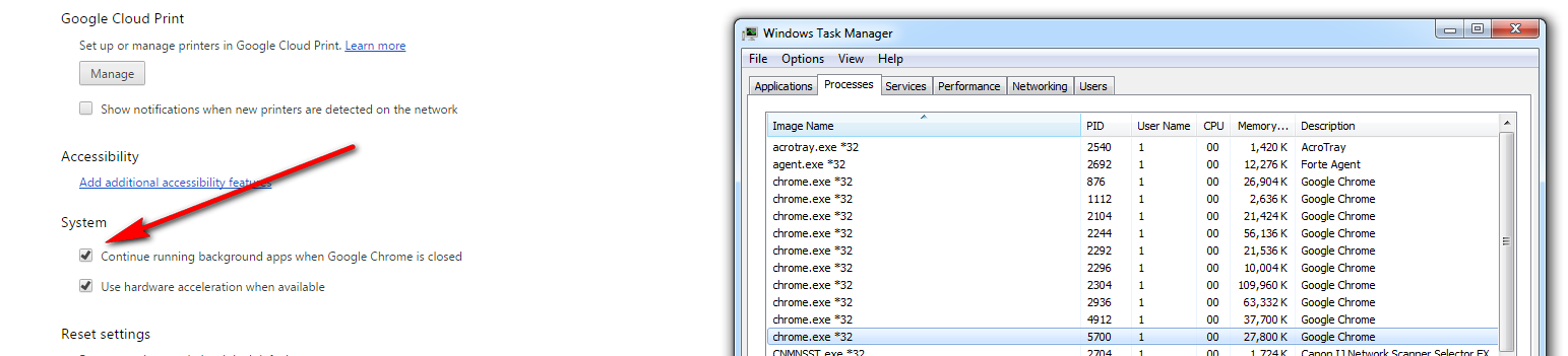if you uncheck allow background chrome processes to run when closed it might help. but chrome pretty much does what it wants, i have 1 tab open in this screenshot and chrome is running multiple versions of itself for reasons unknown.