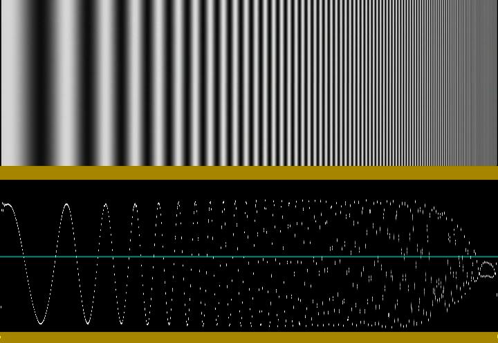 At the bottom you can see that the amplitude of the waveform stays constant until near the right edge. The same signal, recorded onto VHS tape and captured again: