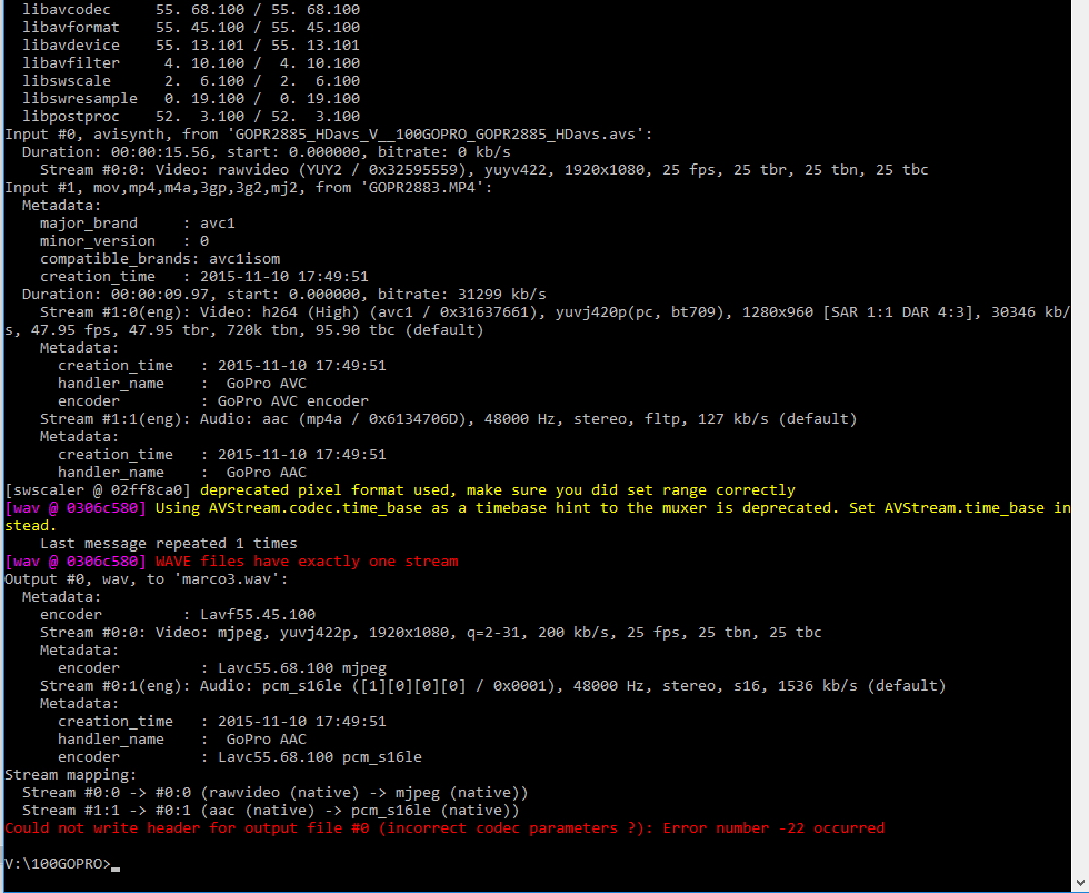 seems almost ok!Code:ffmpeg.exe -y -i VIDEOsource.MP4 -i AUDIOsourceX.MP4 -map 0:v -map 1:a -vcodec mjpeg -shortest -af apad -c:a pcm_s16le marco3.avi