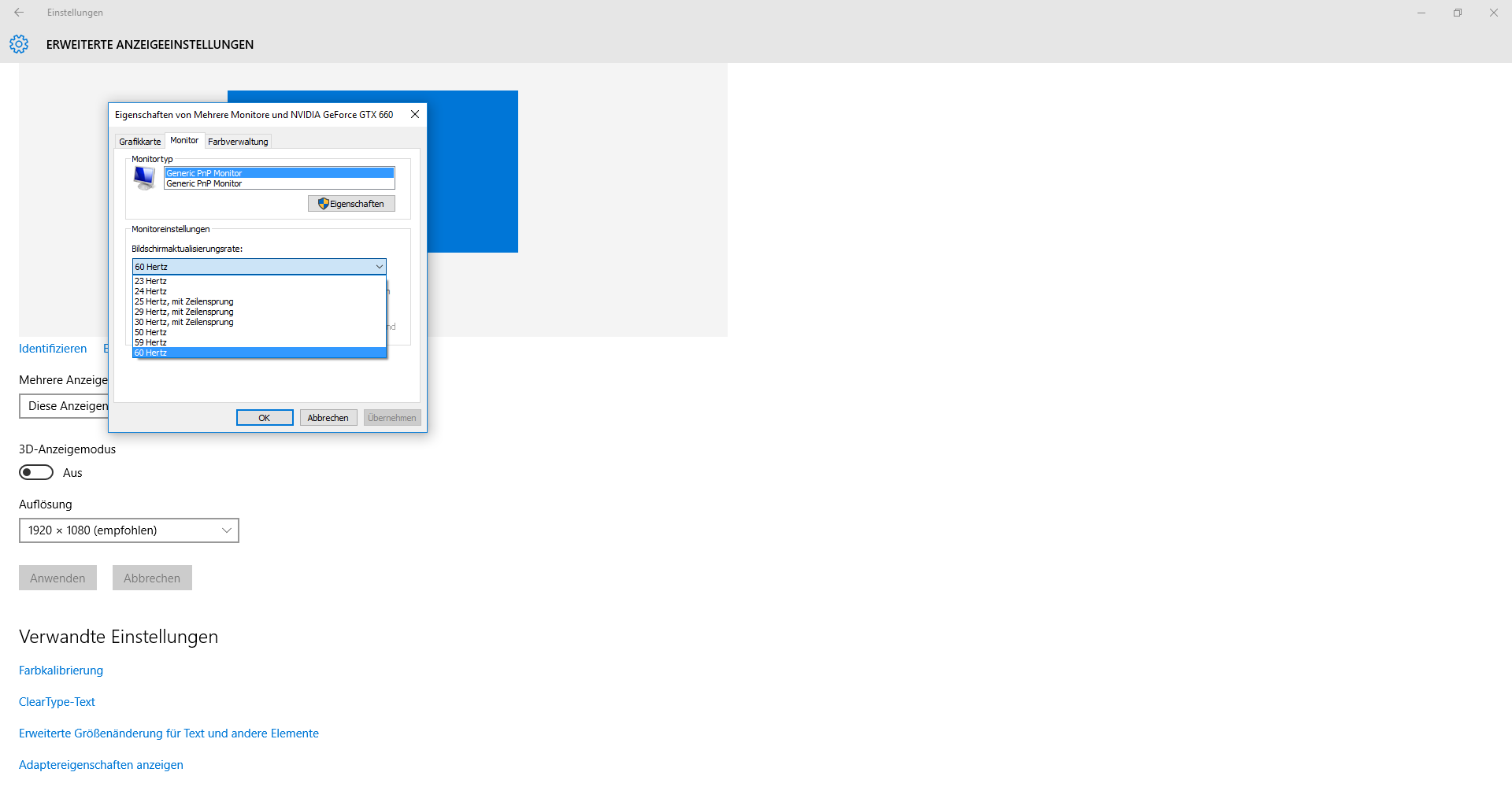 If there is only 60 Hz, we should try a HDMI connection. DVI-D and HDMI uses the same signals, but HDMI supports HDCP and supports all audio formats you can bitstream to your receiver like I do, DTS-HD MA, DTS-HD HR, Dolby Digital, Dolby Digital Plus, Dolby TrueHD, PCM, ..