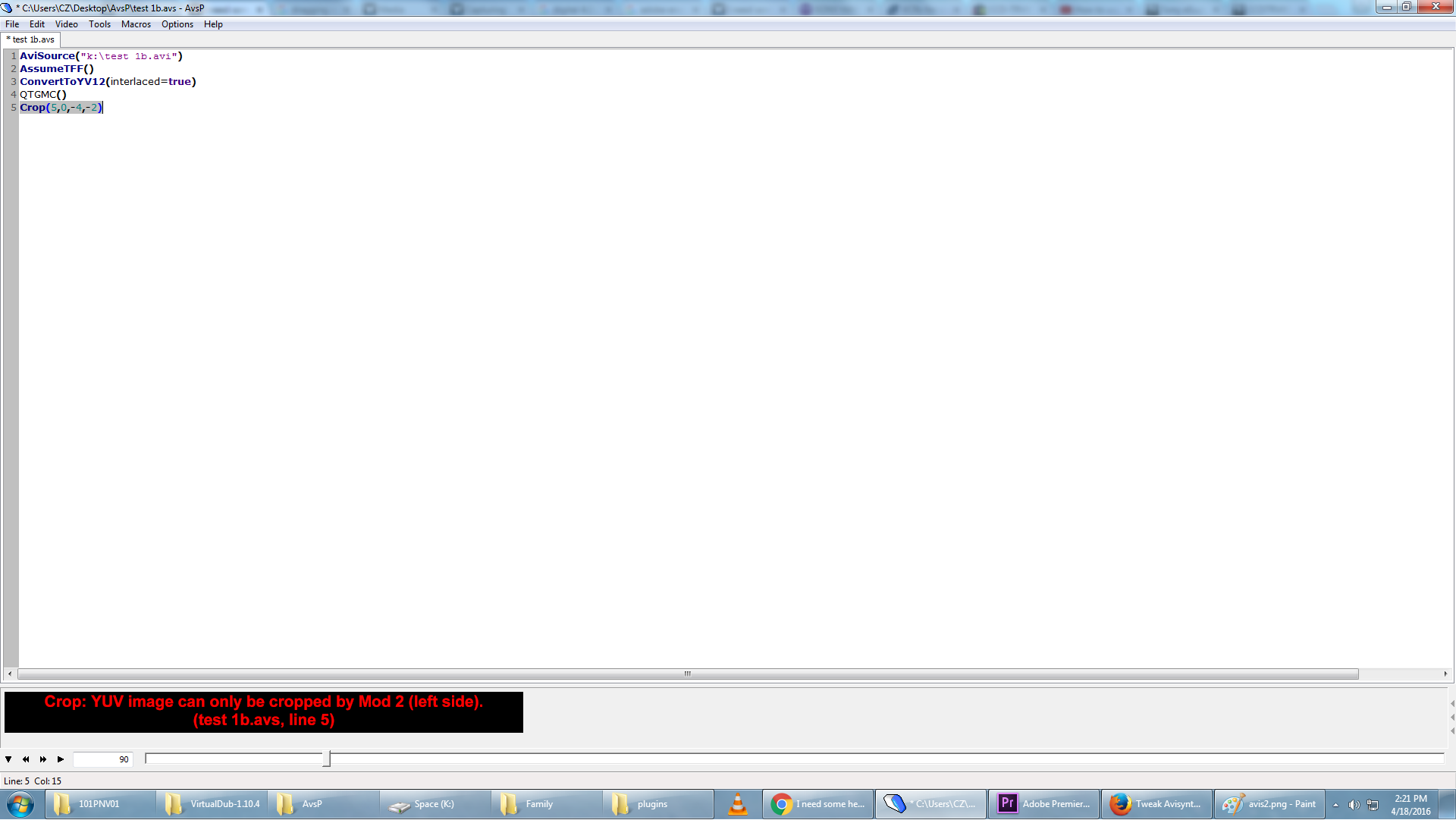 I'm trying to insert some of your stuff from the first video clip you made and those codes into test 1b to try it out for myself but with the 2nd clip (where you barely did anything). I inserted the cropping line of yours and it cropped something, maybe too much I don't know, it was meant for the first clip you did. But every time I try to change one of the dimensions I get this error: