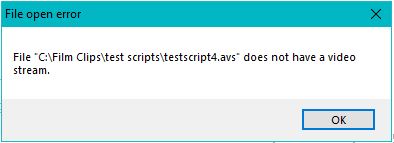 John - I tried the simple script you posted above, and now it works. Which I don't even understand, because until now I literally could not open a one-line script using AviSynth; I could do *other* things using Vdub1 and 2, but not run scripts. One of my last tweaks must accidentally have solved part of the problem. Until now I only received the error below, and I don't understand what it is trying to tell me. The path is correct, so what does "does not have a video stream" mean? Image