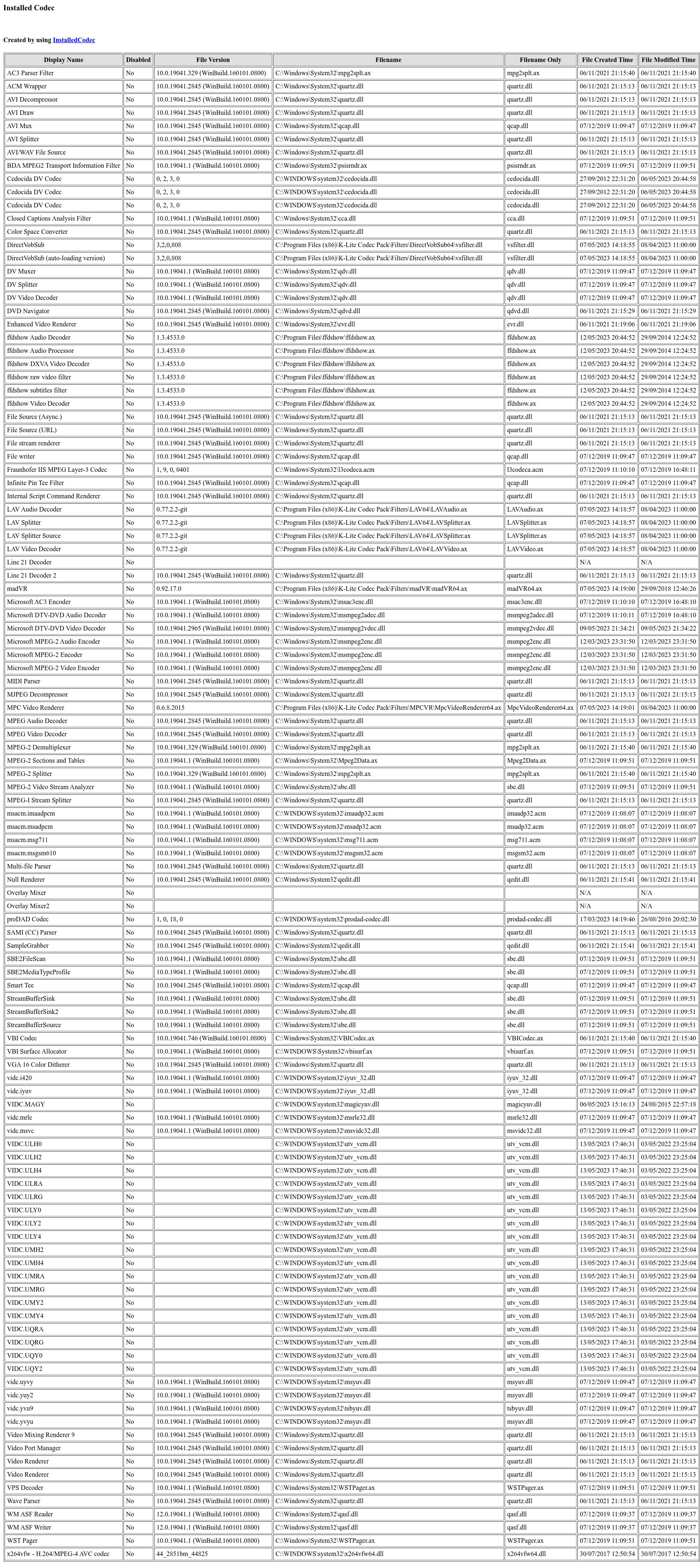 Re: Codecs, I have installed every Codec I saw recommended as useful to this project - but I am not sure if I installed/unzipped them in the right place. I cannot seem to find a definitive answer (using Google at least): do all codecs need to uniformly be put in a single location? Or do different codecs need to be installed in different folders?