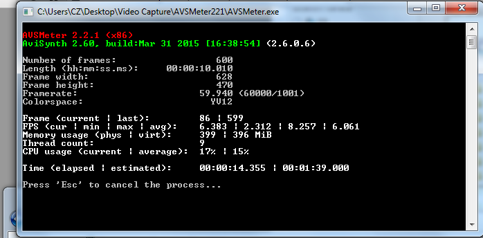 I opened up both AVSMeter and AVSMeter64 and they both flashed on the screen closed in a millisecond...so I don't know what's happening there. Meanwhile x264 is still running with an eta 3hr5min.A very useful diagnostic tool is avsmeter. It can tell you many thing including cpu usage, min/max/avg FPS ,GPU usage for GPU based filters, etc... it can help determine bottlenecks, help arrange /optimize scripts etc...