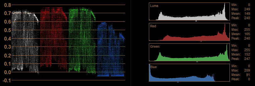 An enlargement of the chroma channels shows bright clipping of red and green, and blue gets submerged and crushed all to hell at the low end.
