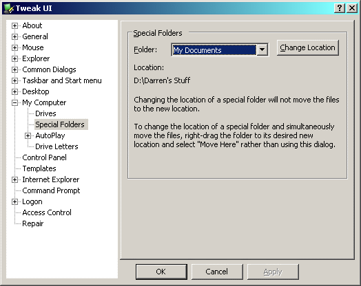 The only problem I found with moving "special folders", is if you're going to move them it's a good idea to do it before installing any software. 99% of the time it's fine but some old software hard-wires itself to the original location when it installs. If at some stage you save something to "My Documents" but it appears to go AWOL, that might be why. Have a look at the old location.