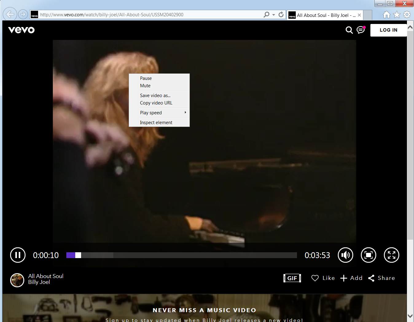 I usually use Firefox but I have it so heavily protected it can't play videos from vevo. I used Internet Explorer to download that video. But I suspect the Save As option is only available because some server is blocked in my hosts file.