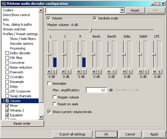 You can re-order ffdshow's filters. I start with a 6dB volume reduction as it seems to allow a little more headroom for downmixing and the compressor plugin to work.