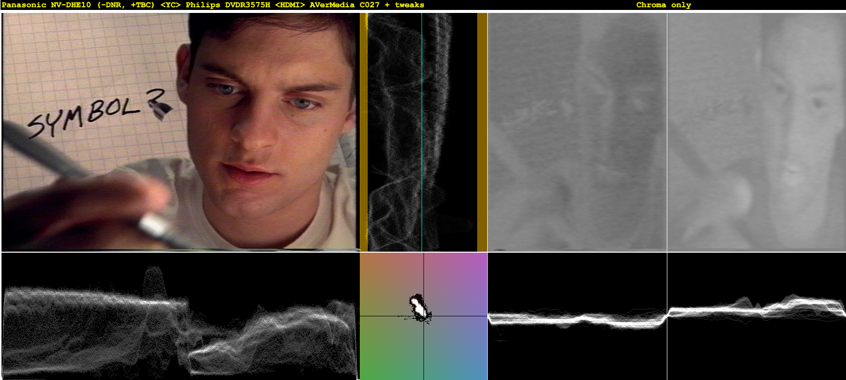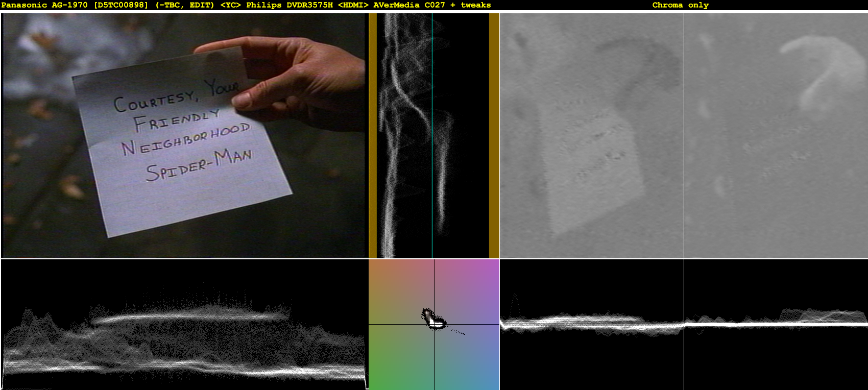 I did the recommended 3 comparison shots of Spiderman on my JVC SR-MV50 <=S-Video=> Hauppauge 1250.