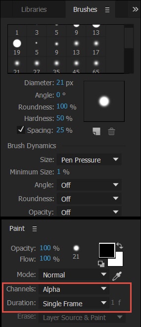 2) Select the brush (or ctrl+b). The 2 important settings for the paint mode - it has to be set to channels: alpha , duration: single frame . The others you can experiment with , brush size etc... hardness is the another one you'll want to play with - that controls the amount of feathering or edge blending between the 2 layers