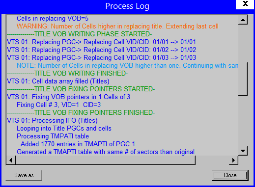 Once you have all the little DVDs of each song/chapter/cell, open the original DVD in VobBlanker, choose the correct VTS for your concert so that it opens in the bottom screen. Highlight it in the lower screen and hit 'Cells' over on the right and in the new screen all the songs/cells are listed. Highlight a cell and hit 'Replace' and replace the old with the new for each. When all done hit 'Apply' followed by 'Close' which brings you back to the main screen. Give it an 'Output Folder' and 'Process'. When all done be sure to test the new DVD thoroughly before burning to disc.