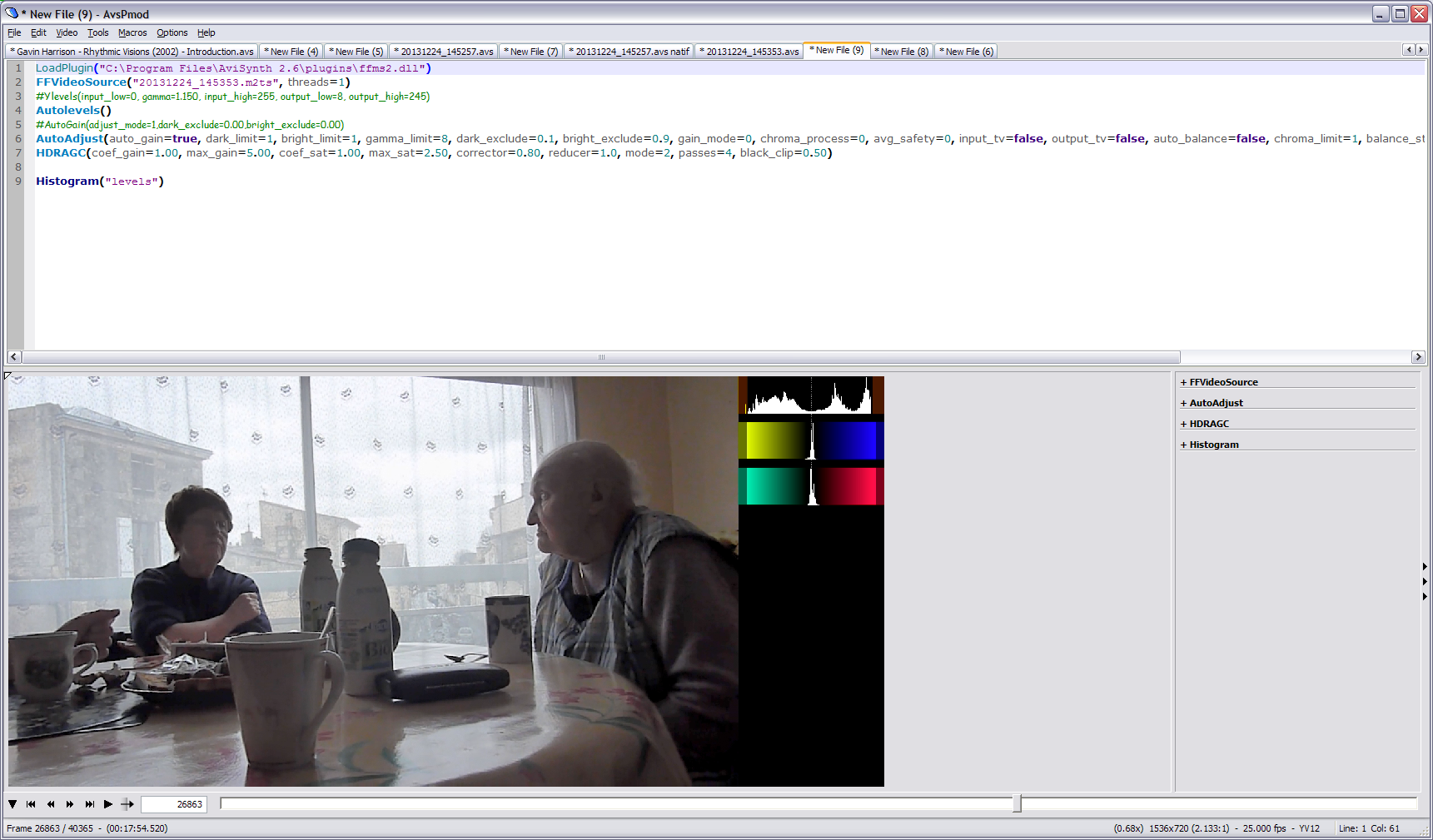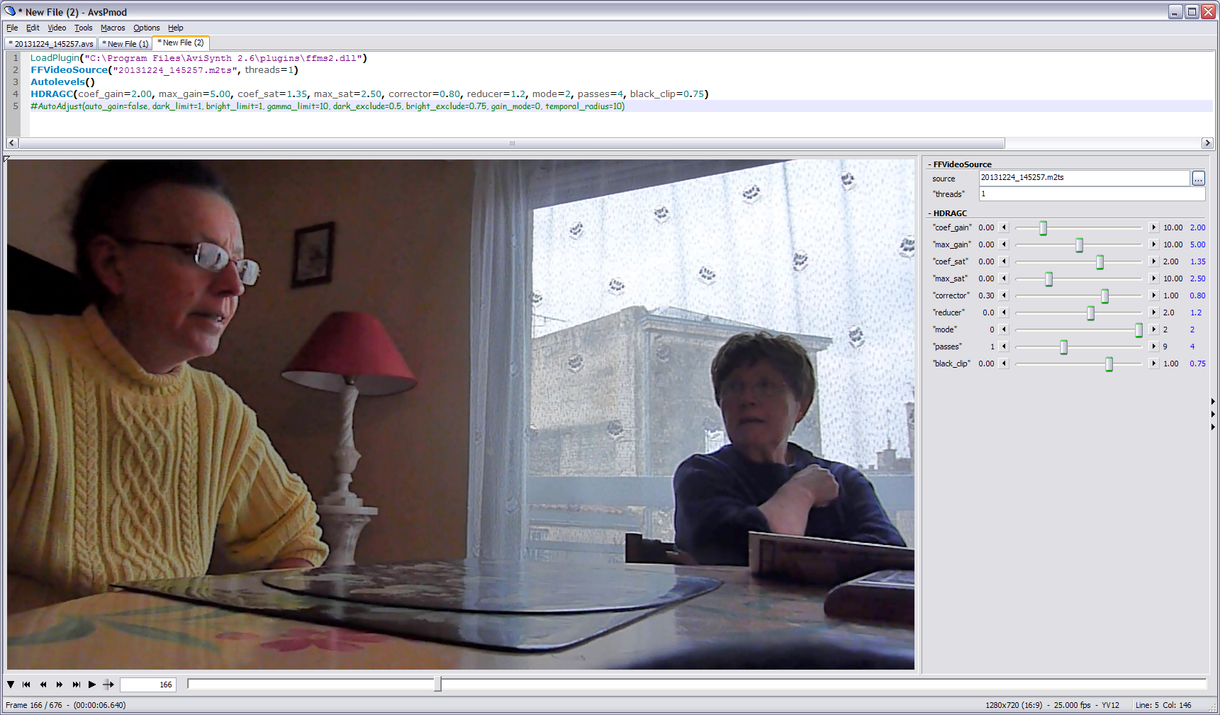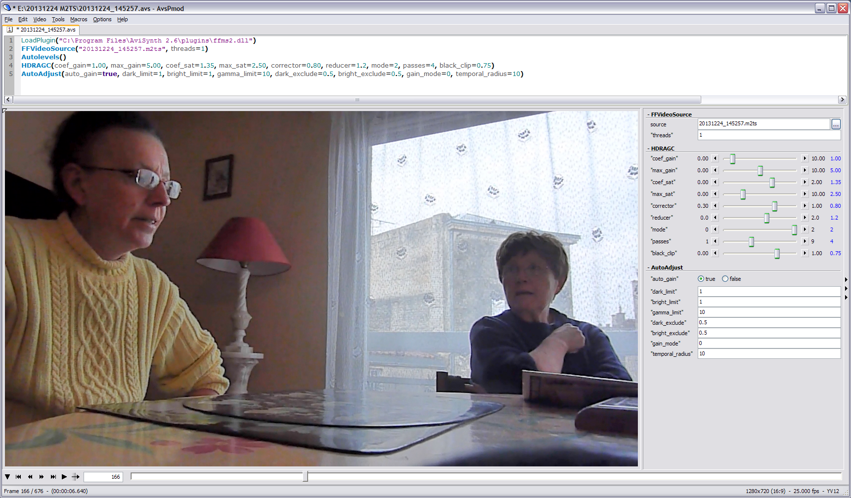 ...which already provided a significant improvement from this :Code:LoadPlugin("C:\Program Files (x86)\AviSynth\plugins\ffms2.dll") FFVideoSource("20131224_145257.m2ts", threads=1) Autolevels() HDRAGC(coef_gain=2.25, max_gain=5.00, coef_sat=1.25, max_sat=1.75, corrector=0.80, reducer=1.2, mode=2, passes=4, black_clip=0.50) AutoAdjust(auto_gain=true, dark_limit=1, bright_limit=1, gamma_limit=10, dark_exclude=0.5, bright_exclude=0.5, gain_mode=0, temporal_radius=10)