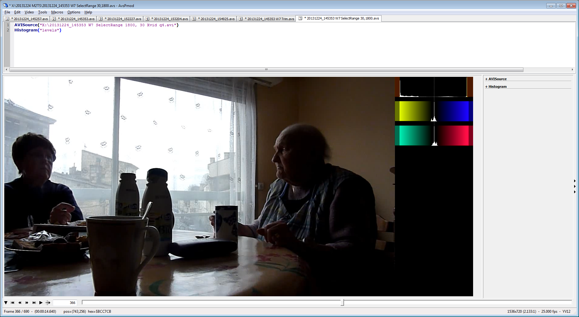 I figured it would be more practical to upload a small file, yet encoded with a relatively high bitrate so that the colors / exposure shouldn't be significantly affected. And it's easy to make small cuts from the whole file in one step with SelectRangeEvery. With TSMuxer (I don't know any other tool which can directly cut M2TS files) doing the same thing is much more tedious (it only allows to cut parts one by one ; a clever script might do the trick but I wouldn't know how to do it, so that it would for example make a first cut between 0s and 1s then increment the cutting timecodes by 60 seconds until the end of the file, then join the parts as one file, all in one step). I tried with MKVMerge and the “split by parts based on timecodes” option (which is supposed to output a single file with all the cuts if each interval is preceded by a “+”), but it doesn't work with those M2TS files, I spent almost an hour making tests trying to understand why : it ignores the timecodes and transcodes the whole file, same without the AC3 audio, same if I take that newly created MKV as source. (It works fine with an MP4 file so the syntax is correct.)But you shouldn't be re-compressing your video at all if you want help filtering it. You're just adding another round of detail loss and compression artifacts. Use an M2TS cutter to trim out representative samples with no recompression.