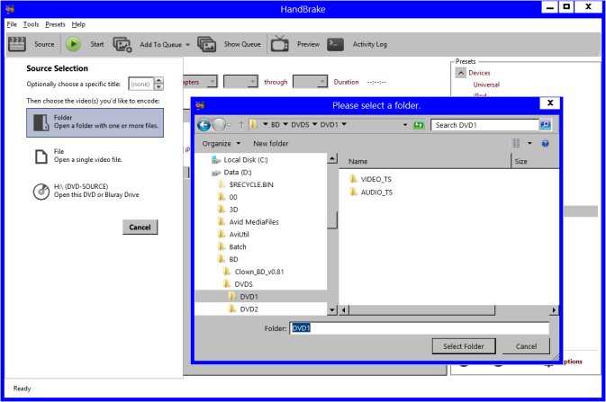 Next use HandBrake. Click on "Source" and select "Folder" and choose the folder of your HDD copy.