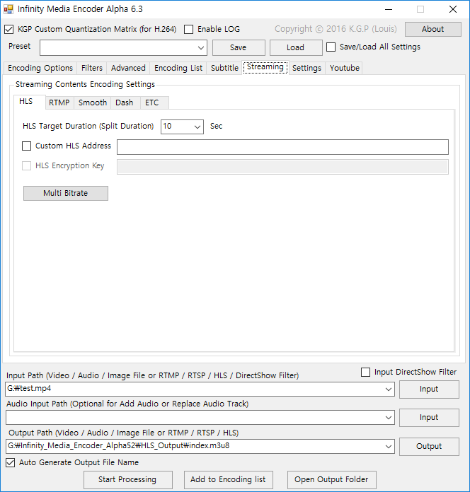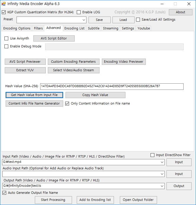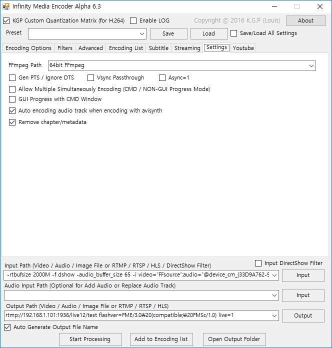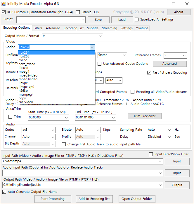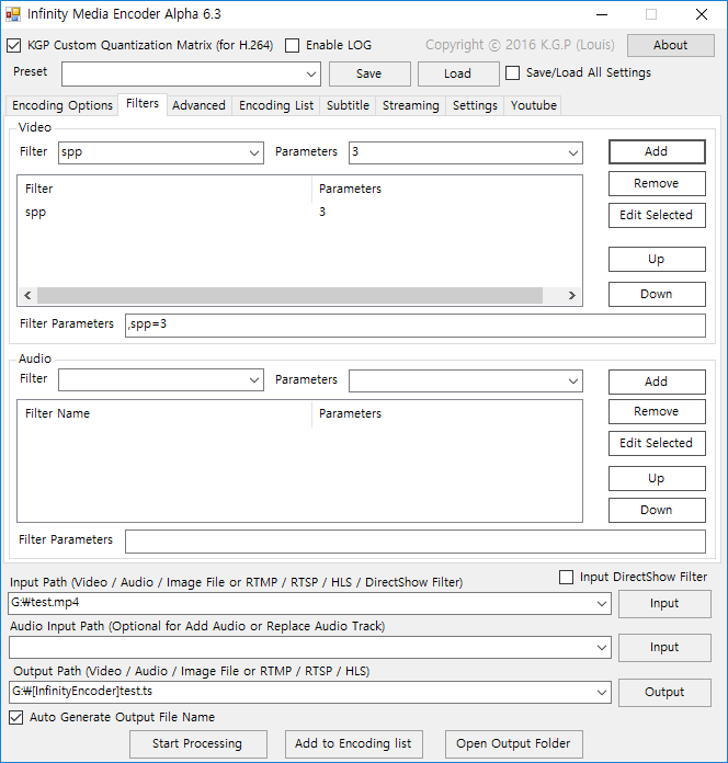 •Custom Encoding parameters (Codec, Video/Audio filter, Custom ffmpeg option (for input/output))