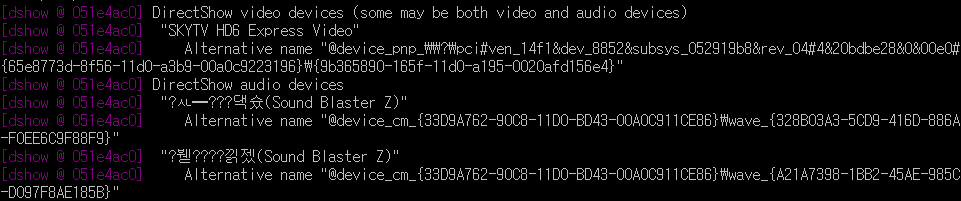 Please try ffmpeg.exe -list_devices true -f dshow -i dummy