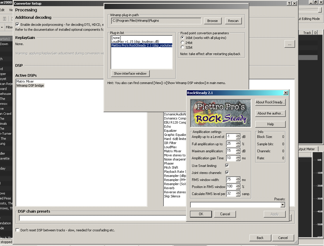 The WinAmp Bridge added the the processing section of a converter setup. It's configuration window is open. In turn it's opened the RockSteady plugin to the settings I use for playback. You don't need to install WinAmp to use the plugins, although I think RockSteady only supports stereo.... now I think about it. LoudMax might support multichannel, if you're into that sort of thing. I'm definitely not, so stereo is fine for me.
