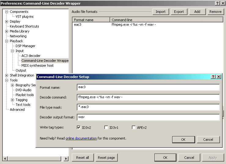 Option number three might be to decode via DirectShow with the help of the DirectShow Input DSP. I haven't played with it a lot but I think the idea is to specify a supported file type for DirectShow Input in preferences and any audio for that file type would be decoded via DirectShow. I've been meaning to test it in preference to using the command line decoder if possible. Now you've reminded me......