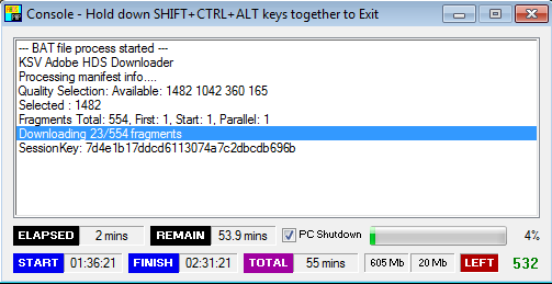 (v3.7) Had cause to want a PC Shutdown option, so added that to Console window. If enabled and no processing error halts things, you get 5 minutes to cancel Shutdown after download has finished and any required conversion has occurred. Next time the program starts you get presented with Results.log and Record.log (if enabled), to check on how things went.