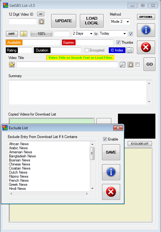 (v4.0) Added a one second delay for video list selection results. NOTE - This can be adjusted in the 'Options.ini' file, but is to prevent thumbnail queries to SBS from being too rapid. For each Mode, you can now save the current list of entries to a Mode file, using the new SAVE button and restore the list using the new LOAD button. In Mode 2 after an UPDATE has finished, the displayed entries are automatically saved to the Mode 2 file. NOTE - Previous Mode file entries are always replaced on subsequent SAVE or UPDATE, so do not rely on these files beyond next use recovery.