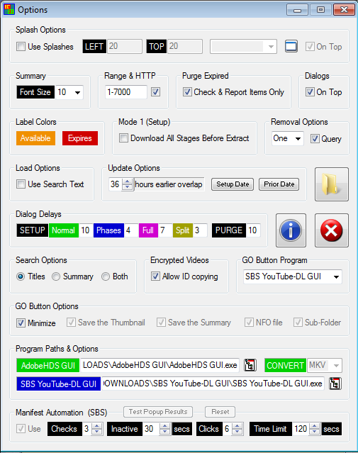 (v3.1) Added improvements to the get Manifest Automation, including adding a popup tester window (via 'Test Popup Results' button), accessed from the 'Options' window. This should mean no need to manually edit the 'Options.ini' file for this automation feature. You just cycle through the popup windows found (some are hidden ones), and SET the correct one. It is possible this may need to be done more than once, if the correct popup window is not a midrange size one. Once a midrange size has been set, all should be good from then on. If Video Title input field does not contain a date, when 'Available' label is clicked, the current date is returned there. Clicking the GO button, a timed prompt now appears about a query to add Title to the URL (Title is not normally used, just ID). Bugfix for program window width, for thumbnail image & related. Added an INI entry for specifying a 'wider' value for Program Window, as I found this to vary between my Win XP and Win 7 machine. The 'wider' value for me with my Win 7 PC, proved to be double that of the Win XP one, so 16 instead of 8. Users can manually change the 'wider=8' in the 'Program Window' section of the 'Options.ini' file, if they notice width issues with the main program window. The value might need to be larger or smaller than the default of '8'. This is a Windows issue that varies from machine to machine I expect, and is border thickness related, and so no doubt due to whatever Theme is being used (Aero, etc).