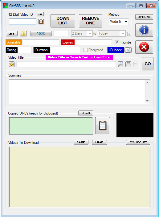 NOTES - The best method to create the Download List, is via one of the LOAD buttons in Mode 4, and then (after specified items have loaded) using the large clipboard button (changed to a Hand via the Options window), with selected video items. Once done, go to Mode 6 and click the DOWN LIST button. You can then use the entries with the GO button, one after the other. The Download List need not be solely used for downloads, it can also be used for a Checklist, etc.