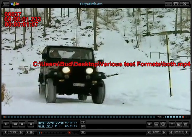 Results inCode:DirectShowSource(("C:\Users\Bud\Desktop\Various test Formats\both.mp4"), Pixel_Type="yuy2").Crop(0,0,-0,-0) Subtitle("C:\Users\Bud\Desktop\Various test Formats\both.mp4", x=640, y=200, font="Arial", size=24, text_color=$ff0000, align=3) ShowFrameNumber(scroll=true, x=10, y=27, font="Arial", size=24, text_color=$ff0000) ShowTime(x=72, y=44, font="Arial", size=24, text_color=$ff0000) ShowSMPTE(fps=30, x=68, y=61, font="Arial", size=24, text_color=$ff0000) -