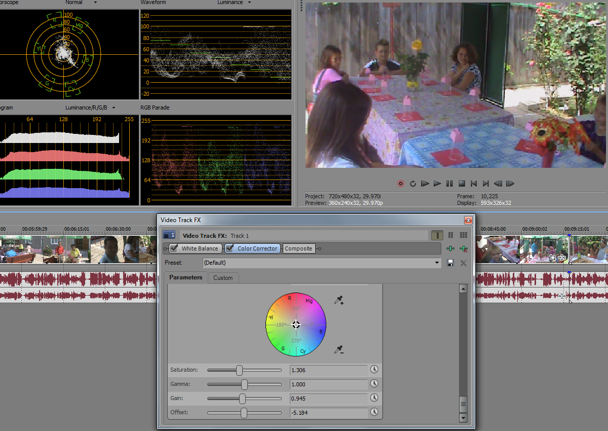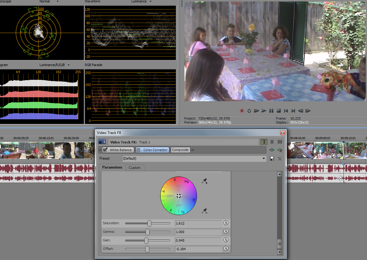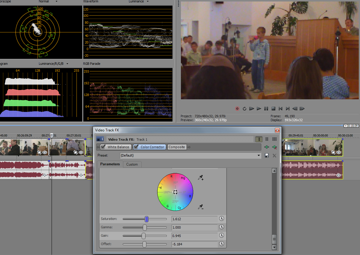 Hm...is this always the case with restoring home videos and tapes or just for my camcorder footage selection? Because a lot of the tutorials and YT videos I came across a while back, teaching you how to fix stuff up in tools like avisynth, almost always had some sort of Tweak code in it as well that included saturating the video to give it "more life."I recommend not adjusting saturation unless you are trying to achieve a special effect. One exception to this is using the Vegas "Secondary Color Corrector." It can let you adjust a specific color range, and only the part of that range which is too saturated. I've seldom seen under-saturated colors. The over-saturated problem is quite common when capturing NTSC video because of the way red is stored. It often tends to bloom, and one correction that can help is to select just that color and then slightly reduce the saturation.