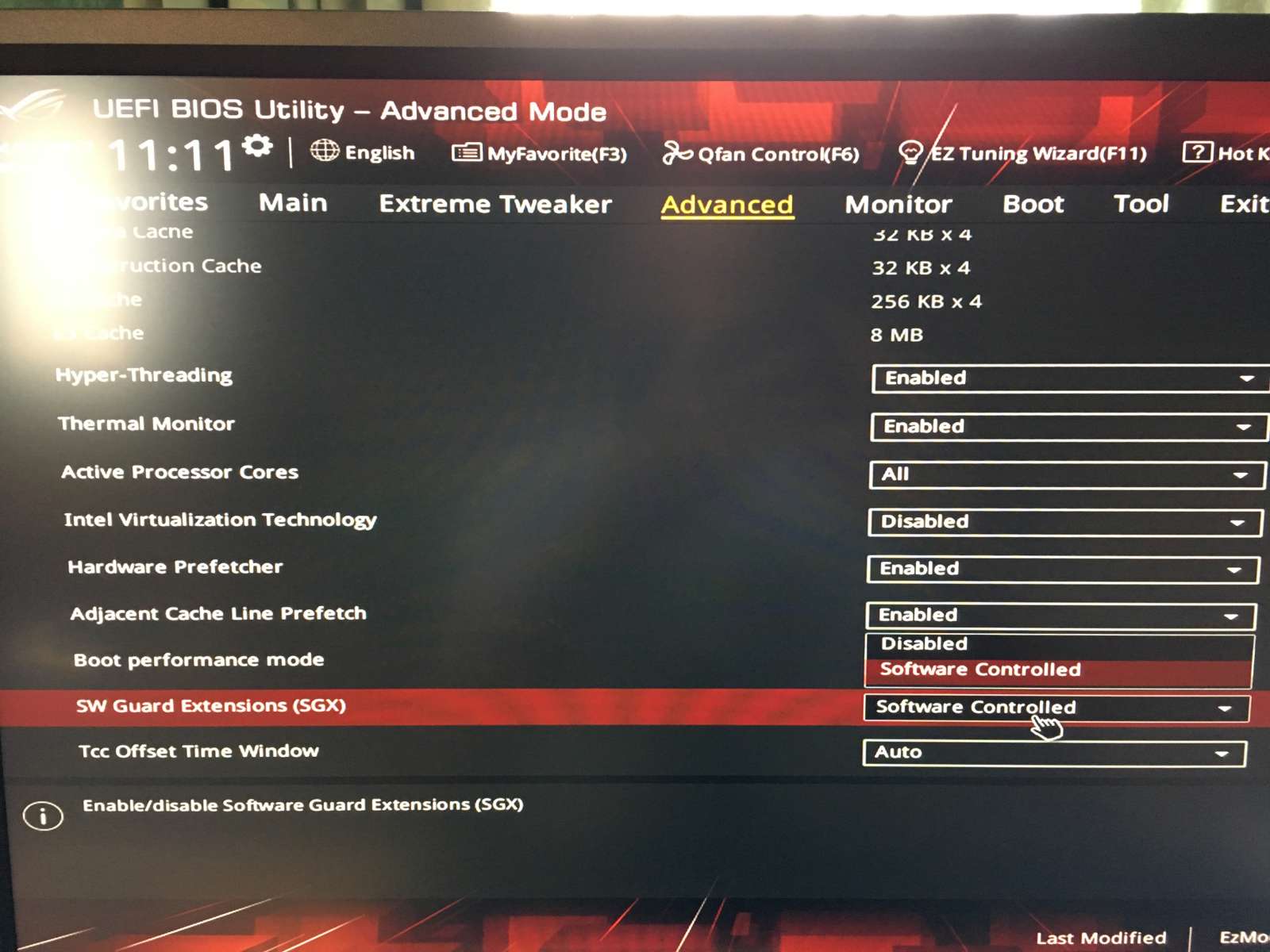 3) Lastly I have a slight glimmer of hope while looking through the BIOS for SGX. Found the setting in the attached screenshot but am not sure whether this is what is required. Could you kindly take a look? The only options are 'Disabled' and 'Software Controlled'. I was expecting to find an 'Enabled' option but didn't.