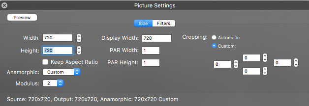 What's the source you're encoding. I ask because a resolution of 720x720 seems a little unusual to me. I don't use Handbrake myself so I don't know if it's displaying 720x720 as it's really the source resolution or because you set that width and height yourself?