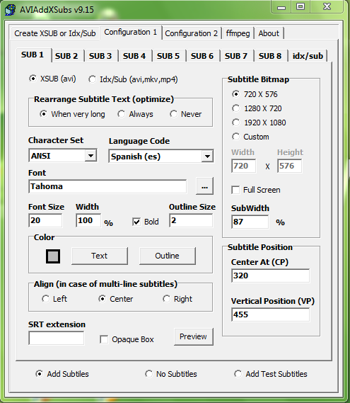 Secondly, I'm worried that I may have an incorrect version of AVIAddXSubs. I am running v9.15, which according to the developer's blogspot is the most recent edition, but I have seen screenshots on some forums of other users who had editions that included options to set PAL or NTSC on the Subtitle Bitmap option (example here: http://www.digital-digest.com/articles/PS3_AVIAddXSubs_AVI_Subtitles_Guide_page2.html). My version of AVIAddXSubs has no such option, and its only Subtitle Bitmap options are 720x576, 1280x720, and 1920x1080. Since (according to the info in my first link) 720x576 is a PAL format resolution, does this mean that my version of AVIAddXSubs is not correct for working with NTSC input files?