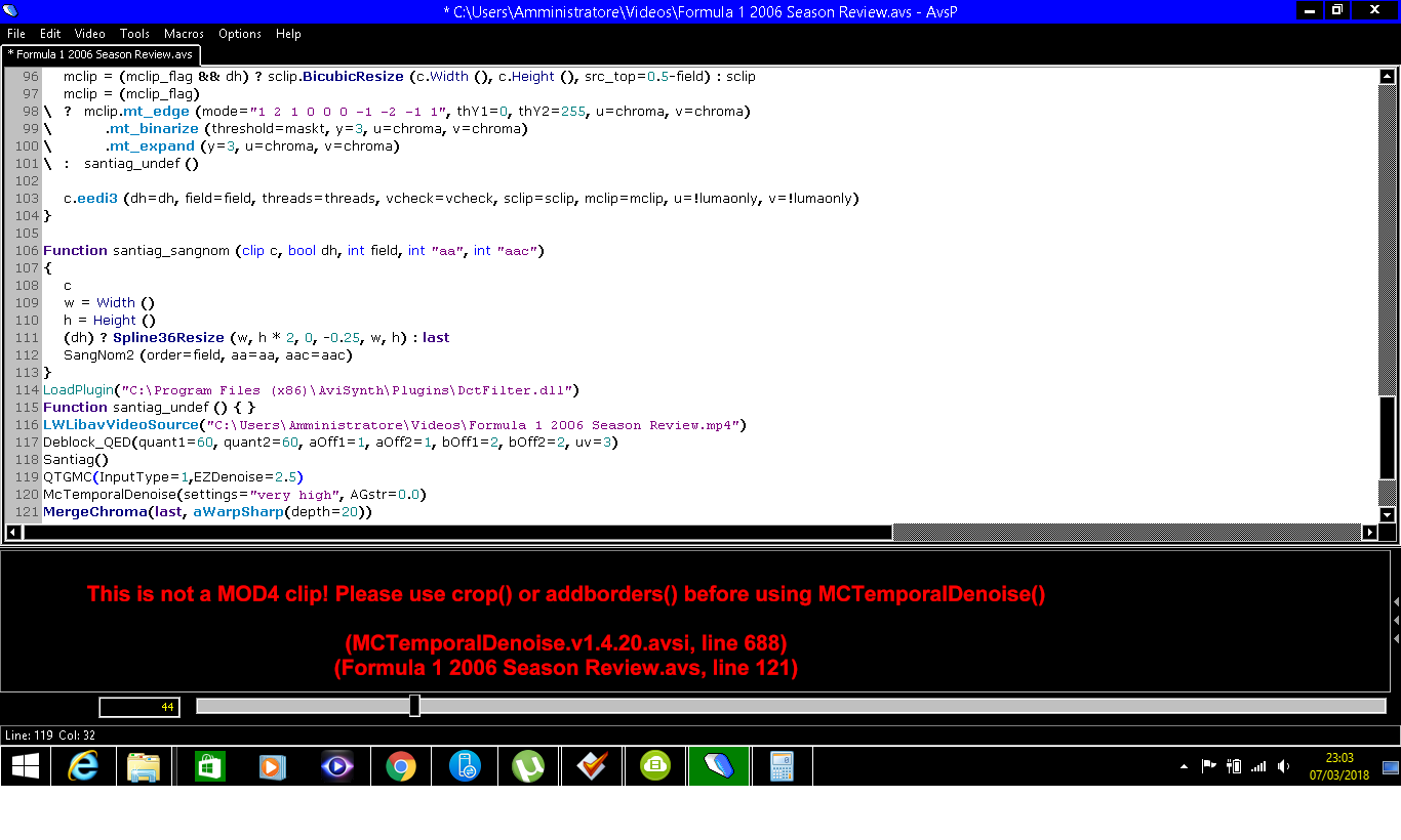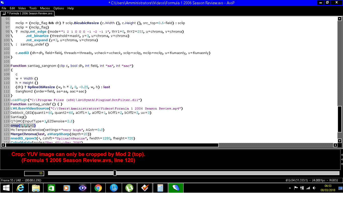 Maybe if you used your head you'd see. Look at that line 120 and you see you're cropping by 1. That's a serious no-no in AviSynth unless you're in RGB. It doesn't mean the resulting resolution has to be Mod2, but the individual crops themselves have to be Mod2 (multiples of 2).