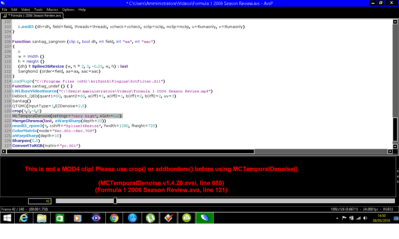 Although it's sharper than then original (when both are played full screen) it looks worse overall.Code:LSmashVideoSource("C:\Users\John\Downloads\F1 1994 Highlights.mp4") Santiag() QTGMC(InputType=1) McTemporalDenoise(settings="low", AGstr=0.0) MergeChroma(last, aWarpSharp(depth=20)) nnedi3_rpow2(4, cshift="Spline36Resize", fwidth=1920, fheight=1080) ColorMatrix(mode="Rec.601->Rec.709") aWarpSharp(depth=10) Sharpen(0.5)Last edited by jagabo; 13th Jan 2018 at 23:29.