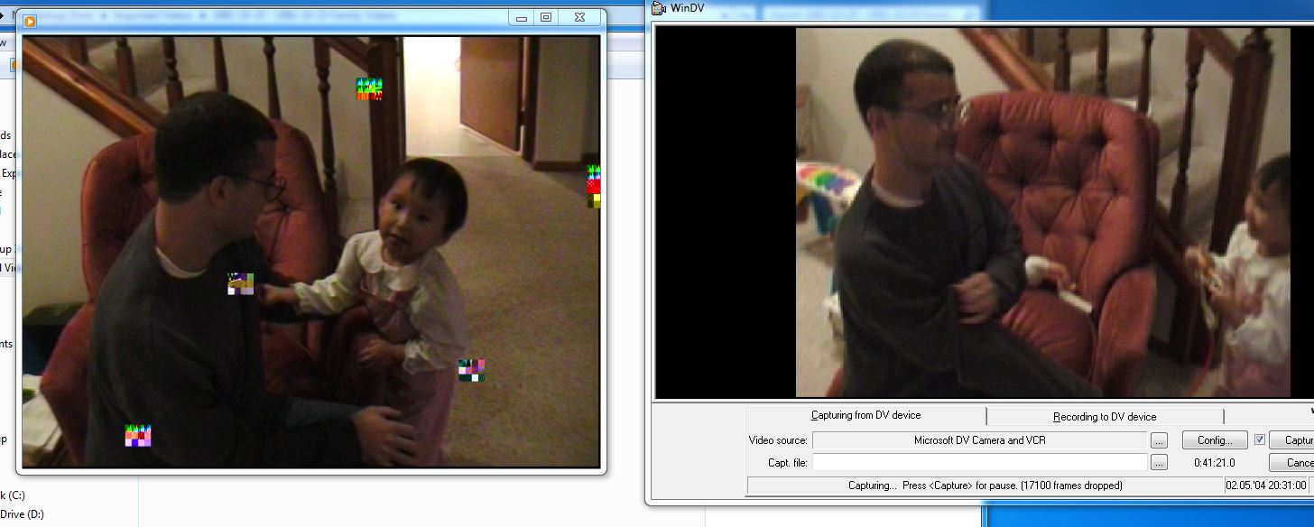Here is an example of a side-by-side of the video playback on the left with Windows Media Player (same results with VLC) and real time capture taking place on the right via WinDV.