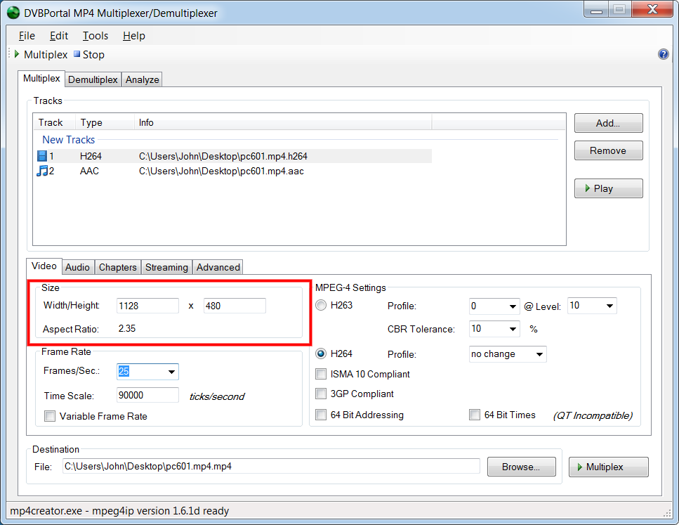 I used My Mp4box to demux with the embedded subtitles. Could have used anything else but in this case the subs were not extractable any other way. Then I joined everything in mkvmerge where I properly labelled the audio track and subs to english and set the ratio at 2.35:1. -
