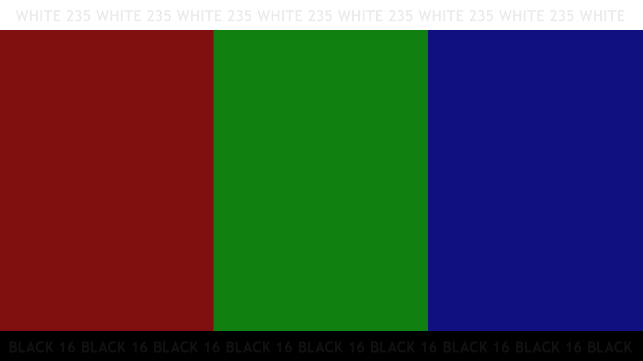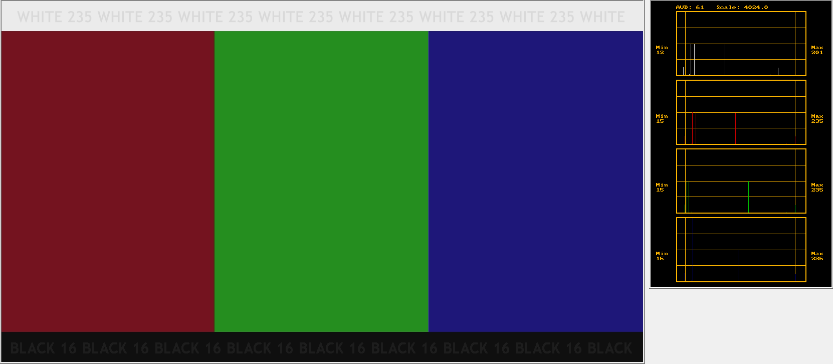 I very purposefully set the red, green and blue regions to level 128 (and compliments to 16) to straddle the center lines when the data are plotted. Additionally, I added a 235 white and 16 black along the top and bottom to possibly catch other irregularities as my project data moves from editor stage to encoder stage.