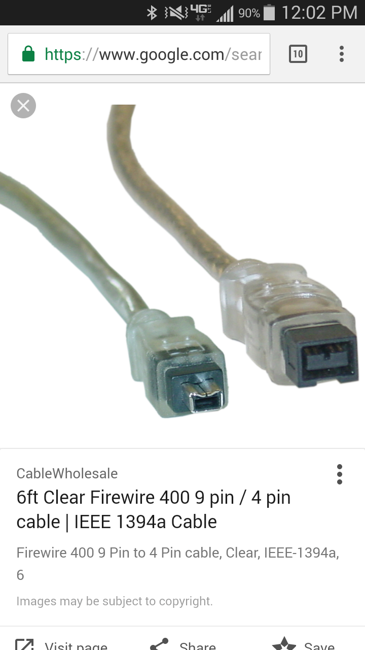 used the 9-pin to 4-pin firewire cable. I also had to use the 1394 legacy drivers for windows