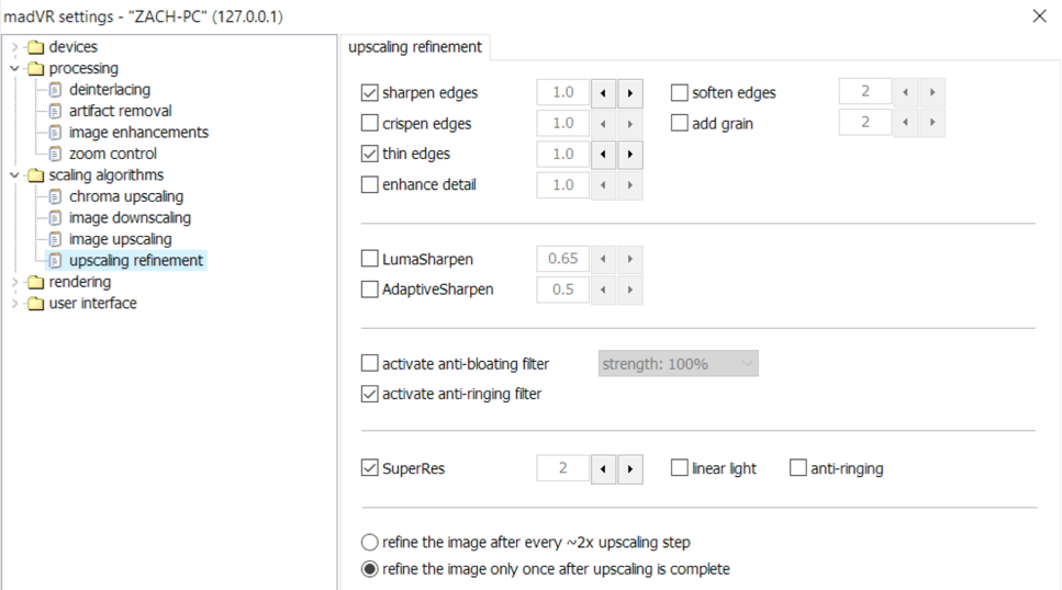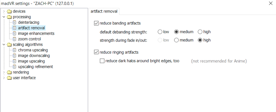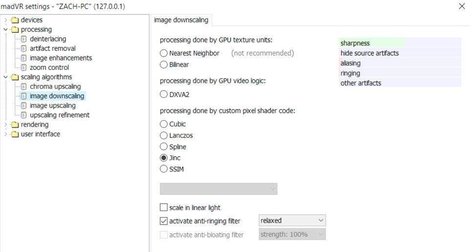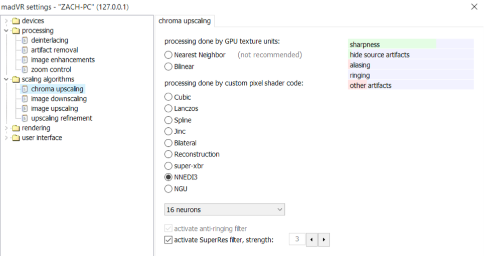 3. Image upscaling: Using NNEDI 3 with image doubling 64 neurons and 32 quadrupling, when I watch a 1080p movie this doesn't hit performance but when I watch a 720p movie I get mad artifacts. I assume it's only relevant to upscaling 720p to 1080p and that's why I get artifacts. I tried switching to NGU (It has the exact same performance as NNEDI3) and the artifacts were gone.