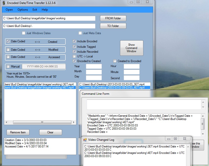 Just so you know, the Utility takes the Windows Created OR the Manual OR the Windows Modified and sets it into the videos Encoded AND Tagged dates, if the Created to Encoded box is checked. If the Encoded to Created box is checked, it will take the Encoded OR Tagged OR Recorded date and set it into the corresponding Windows Created AND/OR Modified Dates.