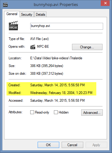Raffriff42 is correct which is why i made the utility shown above and posted to this site change/add encoded date from the modified date if checked. This encoded date can then be used to change created modified date to match. Just depends on whether you check the created to encoded or encoded to created checkbox. Sometimes modified date is the only source of true video encoded time.