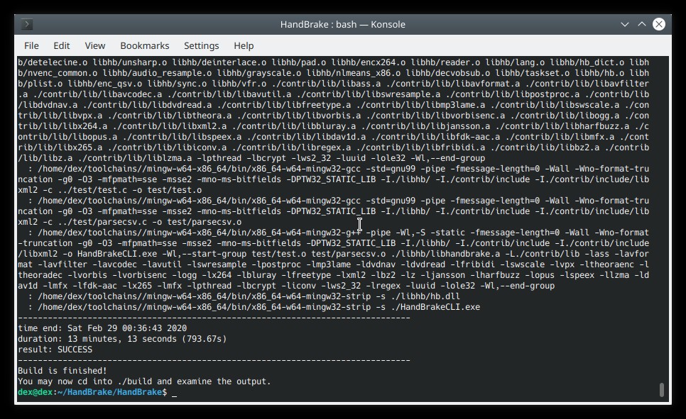 Code:sudo apt-get install autoconf automake bison build-essential bzip2 cmake curl flex gcc git gzip g++ intltool libtool libtool-bin m4 make patch pax pkg-config python tar wget yasm zlib1g-dev sudo apt autoremove rm -rf HandBrake/ git clone https://github.com/HandBrake/HandBrake.git cd HandBrake/ git tag git checkout tags/1.1.1 cd HandBrake/scripts/mingw-w64-build x86_64.distclean HandBrake/scripts/mingw-w64-build x86_64 export PATH="/home/jmraja/toolchains/mingw-w64-5.0.3-gcc-7.2.0/mingw-w64-x86_64/bin:${PATH}" x86_64-w64-mingw32-gcc -v cd HandBrake ./configure --cross=x86_64-w64-mingw32 --enable-x265 --enable-qsv --enable-fdk-aac --enable-libav-aac --launch-jobs=1 --force --launch cd -