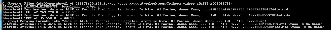 youtube-dl -f 266576120412641v+m4a https://www.facebook.com/Tribeca/videos/10155341025099758/