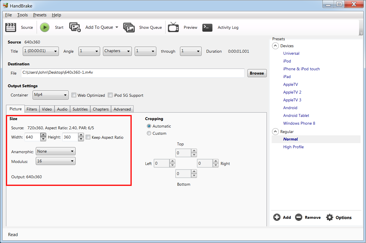 I have explained this throughout these posts. I have resized hundreds of videos from an ultra-wide format or letter-box format to a 16/9 format using Handbrake, Any Video Converter, and several other video converters. However, I have been getting several videos like this one that will not convert as normal. This video states it is in a 720X360 format but if I try to convert it to a 640X360 format which is 16/9 format it will not change the format at all and it plays in the exact same letterbox format. These videos are somehow being locked into a format that cannot be resized, or have the aspect ratio converted, as normal. I am just trying to figure out what is being done to these videos to cause this problem and if there is a way to repair them so they can be resized into any format that I choose.