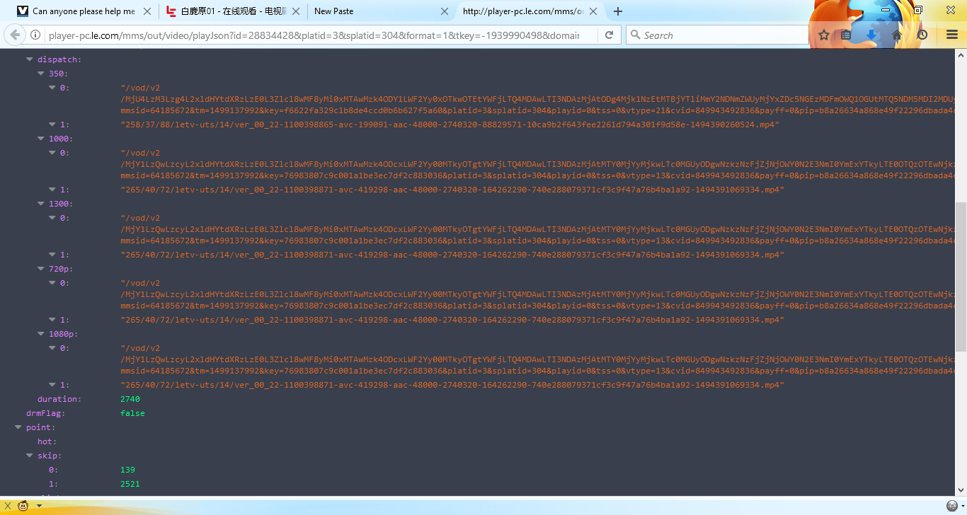 URL:Code:code 1 msgs playurl videoType 180001 "正片" cid "2" pid 10014722 vid 28834428 mid ",64185672," title "白鹿原01" picAll 640*320 "http://i3.letvimg.com/lc07_isvrs/201704/15/17/01/0c0389bb-f9ee-462e-a5f0-04a644825096.jpg" 400*300 "http://i3.letvimg.com/lc07_isvrs/201704/15/17/01/5e25a275-6a6f-49eb-bbf7-93d072eb71cd.jpg" 300*400 "http://i2.letvimg.com/lc09_yunzhuanma/201705/10/12/24/f68752d1db9e982b70c5931ed4dc22d3_v2_MTI4MzcyMzQ0/thumb/2_300_400.jpg" 400*225 "http://i0.letvimg.com/lc06_isvrs/201704/15/17/01/e84f0af9-4839-48bf-9922-01d60a330be5.jpg" 400*250 "http://i2.letvimg.com/lc06_isvrs/201704/15/17/01/aa0e35a3-07b0-4ecb-bede-f91689386aaf.jpg" pic "http://i3.letvimg.com/lc05_isvrs/201704/15/17/01/843c8aed-0c69-4878-96c9-a368701c7245.jpg" filter 1 total 77 nextvid 29393681 subtitle "" domain 0 "http://play.g3proxy.lecloud.com" 1 "http://bplay.g3proxy.lecloud.com" 2 "http://115.182.92.127" dispatch 350 0 "/vod/v2/MjU4LzM3Lzg4L2xldHYtdXRzLzE0L3Zlcl8wMF8yMi0xMTAwMzk4ODY1LWF2Yy0xOTkwOTEtYWFjLTQ4MDAwLTI3NDAzMjAtODg4Mjk1NzEtMTBjYTliMmY2NDNmZWUyMjYxZDc5NGEzMDFmOWQ1OGUtMTQ5NDM5MDI2MDUyNC5tcDQ=?b=259&mmsid=64185672&tm=1498953381&key=5ab7f3a3f1bffe4cbb1c8092f86e9a99&platid=1&splatid=101&playid=0&tss=0&vtype=21&cvid=849943492836&payff=0&pip=b8a26634a868e49f22296dbada4c8208" 1 "258/37/88/letv-uts/14/ver_00_22-1100398865-avc-199091-aac-48000-2740320-88829571-10ca9b2f643fee2261d794a301f9d58e-1494390260524.mp4" 1000 0 "/vod/v2/MjY1LzQwLzcyL2xldHYtdXRzLzE0L3Zlcl8wMF8yMi0xMTAwMzk4ODcxLWF2Yy00MTkyOTgtYWFjLTQ4MDAwLTI3NDAzMjAtMTY0MjYyMjkwLTc0MGUyODgwNzkzNzFjZjNjOWY0N2E3NmI0YmExYTkyLTE0OTQzOTEwNjkzMzQubXA0?b=479&mmsid=64185672&tm=1498953381&key=cedd5e50825869aa367698d7a36e6686&platid=1&splatid=101&playid=0&tss=0&vtype=13&cvid=849943492836&payff=0&pip=b8a26634a868e49f22296dbada4c8208" 1 "265/40/72/letv-uts/14/ver_00_22-1100398871-avc-419298-aac-48000-2740320-164262290-740e288079371cf3c9f47a76b4ba1a92-1494391069334.mp4" 1300 0 "/vod/v2/MjY1LzQwLzcyL2xldHYtdXRzLzE0L3Zlcl8wMF8yMi0xMTAwMzk4ODcxLWF2Yy00MTkyOTgtYWFjLTQ4MDAwLTI3NDAzMjAtMTY0MjYyMjkwLTc0MGUyODgwNzkzNzFjZjNjOWY0N2E3NmI0YmExYTkyLTE0OTQzOTEwNjkzMzQubXA0?b=479&mmsid=64185672&tm=1498953381&key=cedd5e50825869aa367698d7a36e6686&platid=1&splatid=101&playid=0&tss=0&vtype=13&cvid=849943492836&payff=0&pip=b8a26634a868e49f22296dbada4c8208" 1 "265/40/72/letv-uts/14/ver_00_22-1100398871-avc-419298-aac-48000-2740320-164262290-740e288079371cf3c9f47a76b4ba1a92-1494391069334.mp4" 720p 0 "/vod/v2/MjY1LzQwLzcyL2xldHYtdXRzLzE0L3Zlcl8wMF8yMi0xMTAwMzk4ODcxLWF2Yy00MTkyOTgtYWFjLTQ4MDAwLTI3NDAzMjAtMTY0MjYyMjkwLTc0MGUyODgwNzkzNzFjZjNjOWY0N2E3NmI0YmExYTkyLTE0OTQzOTEwNjkzMzQubXA0?b=479&mmsid=64185672&tm=1498953381&key=cedd5e50825869aa367698d7a36e6686&platid=1&splatid=101&playid=0&tss=0&vtype=13&cvid=849943492836&payff=0&pip=b8a26634a868e49f22296dbada4c8208" 1 "265/40/72/letv-uts/14/ver_00_22-1100398871-avc-419298-aac-48000-2740320-164262290-740e288079371cf3c9f47a76b4ba1a92-1494391069334.mp4" 1080p 0 "/vod/v2/MjY1LzQwLzcyL2xl…868e49f22296dbada4c8208" 1 "265/40/72/letv-uts/14/ve…a1a92-1494391069334.mp4" duration 2740 drmFlag false point hot skip 0 139 1 2521 paylist 0 "1080p" firstlook "0" playstatus status "1" isTryLook "0" danmu 1 trylook "0" trylookTime 0 watermark imgs 0 position "2" url100 "http://i1.letvimg.com/lc04_iscms/201601/12/15/22/47615b27e213449da27bfd356df13f38.png" lasttime "1800" link "" 1 position "1" url100 "http://i0.letvimg.com/lc04_iscms/201601/12/15/22/afd7ca79d3564037acd9606ce04069c2.png" lasttime "1800" link "" offset "3" statuscode 1001 vtypeFlag false curVType "1000"