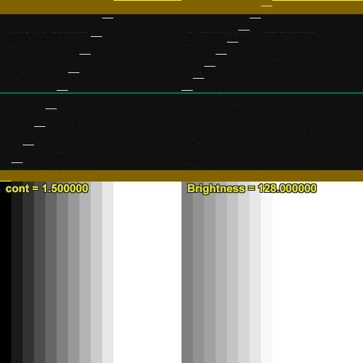 The contrast increase is on the left. The zero bar is still zero and the other bars have increased proportionally by about 1.5x. The brightness increase on the right has increased the brightness of all bars by the same amount, 128. So the 0 bar has increased to 128, the 17 bar has increased to 145, etc. In both cases the brightest bars are clamped at 255 because that's the highest value that can be represented in 8 bit YUV/RGB.