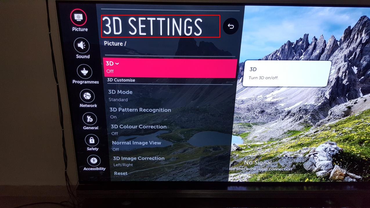 in your settings picture you have 3d set to "dual play" - that's only for using the tv for 2 player games. try clicking the reset 3d settings button and try the stock settings.