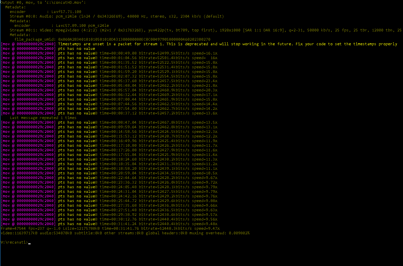 this MXF's are xdcam hd 4:2:2 video files.Code:file 'V:\recanati\C0003.MXF' file 'V:\recanati\C0005.MXF' file 'V:\recanati\C0008.MXF' file 'V:\recanati\C0010.MXF' file 'V:\recanati\C0013.MXF' file 'V:\recanati\C0015.MXF' file 'V:\recanati\C0016.MXF' file 'V:\recanati\C0017.MXF' file 'V:\recanati\C0018.MXF' file 'V:\recanati\C0019.MXF' file 'V:\recanati\C0020.MXF' file 'V:\recanati\C0021.MXF' file 'V:\recanati\C0022.MXF' ... ... file 'V:\recanati\C0116.MXF'