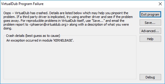 I've hit a weird problem in Virtualdub when dealing with very large files. The input files aren't particularly big - it's the process of outputting that seems to go wrong. I originally had this problem when trying to output a 1.5hr HD file using HuffyUV. It seems that somewhere between 300-400GB it can't handle any more, and crashes. I have included a screengrab of the image below.