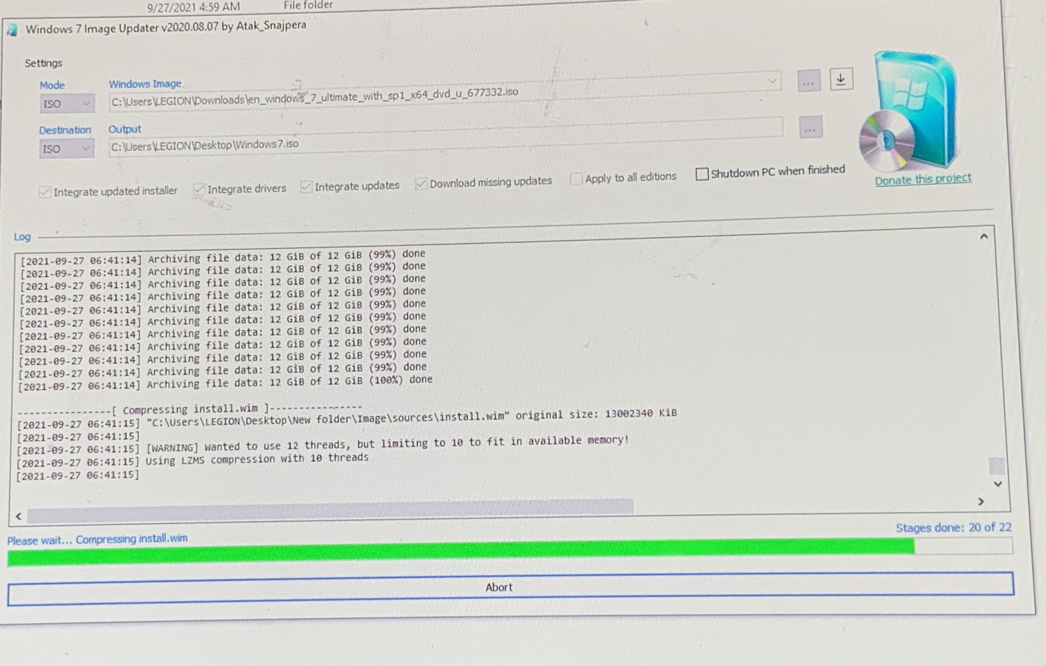 The software took 63 minutes to create my new ISO with no errors - I have a genuine Windows 7 ISO.